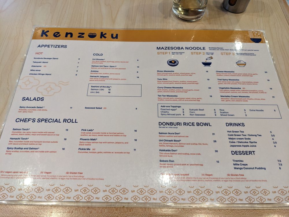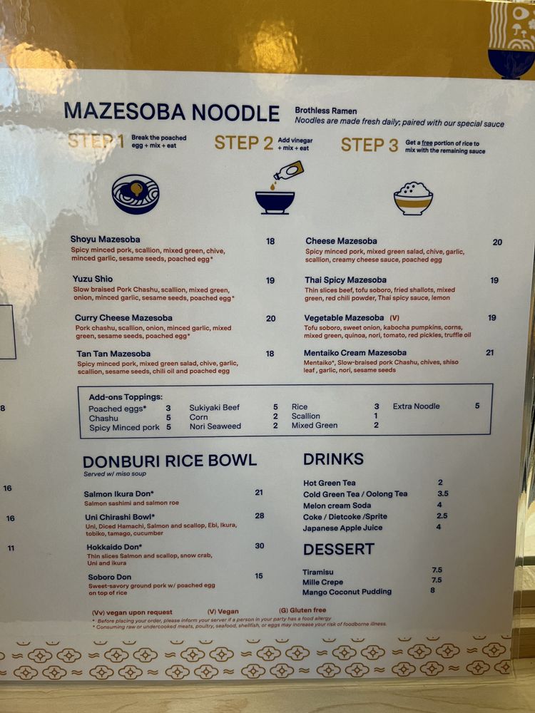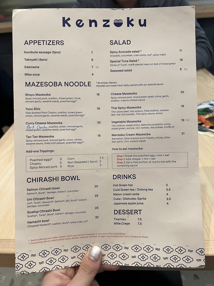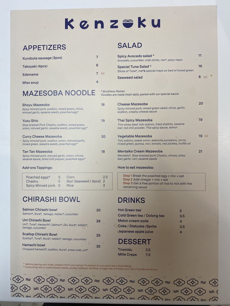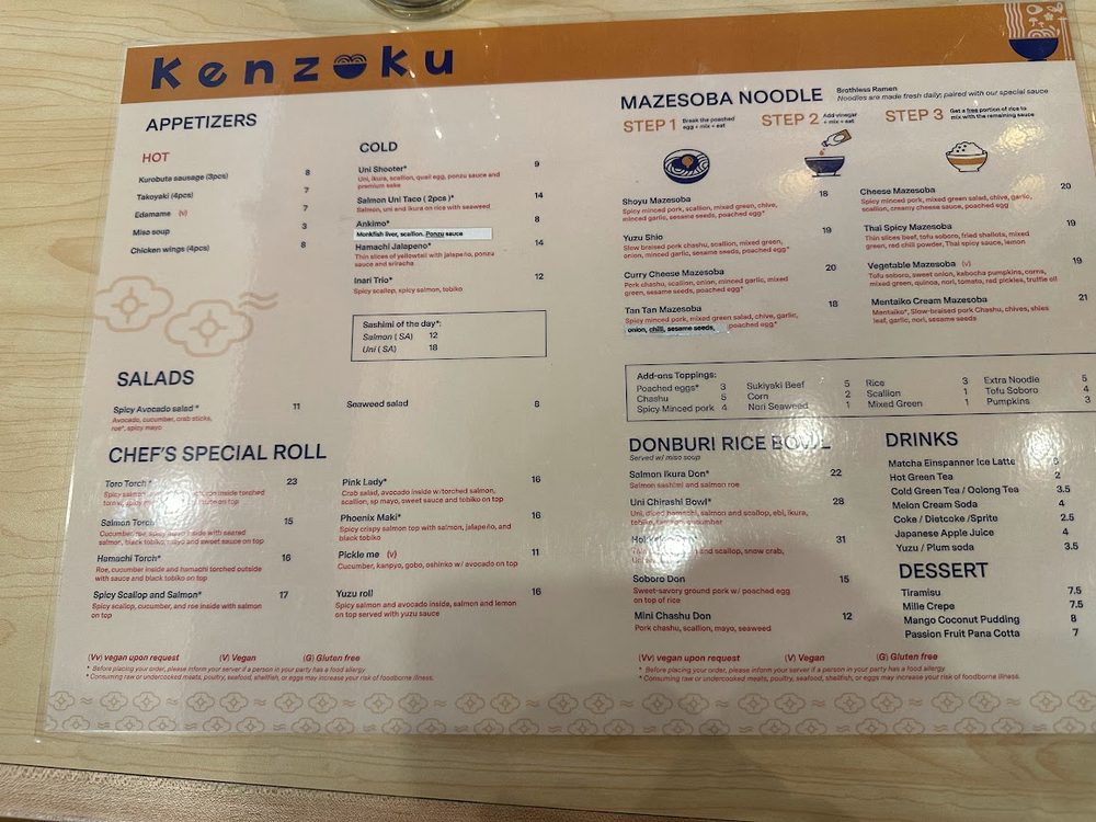 Wrapping up my visit to Kenzoku Mazesoba, I can confidently say this spot at 506 Park Dr in Boston delivers both comfort and creativity through its flavorful Japanese-inspired menu. The appetizers set a delicious tone, especially the juicy Kurobuta Sausage ($8.00) and the crisp, spicy Chicken Wings ($8.00) that come with a punchy sauce. Moving to the main attraction, the mazesoba noodles are the stars — from the savory Shoyu Mazesoba ($19.00) and aromatic Yuzu Shio ($20.00) to the indulgent Curry Cheese Mazesoba ($21.00), each bowl balances rich textures and layers of spice and umami. For something unique, the Thai Spicy Mazesoba ($19.00) bursts with bold chili heat, while the Vegetable Mazesoba ($19.00) offers a wholesome vegan alternative with truffle oil and vibrant veggies. Sushi lovers aren’t forgotten either; the Salmon Torch Maki ($16.00) and Phoenix Maki ($17.00) blend freshness with a hint of flame-seared smokiness, and the luxurious Uni Chirashi Bowl ($30.00) feels like pure indulgence. To finish, the Tiramisu ($8.00) or Mille Crepe ($8.00) make for a light yet satisfying dessert. Paired with a refreshing Melon Cream Soda ($5.00) or a simple Cold Green Tea ($3.50), every dish reflects Kenzoku Mazesoba’s careful balance of tradition and modern flair — an inviting spot where each bite feels thoughtfully crafted and genuinely comforting.